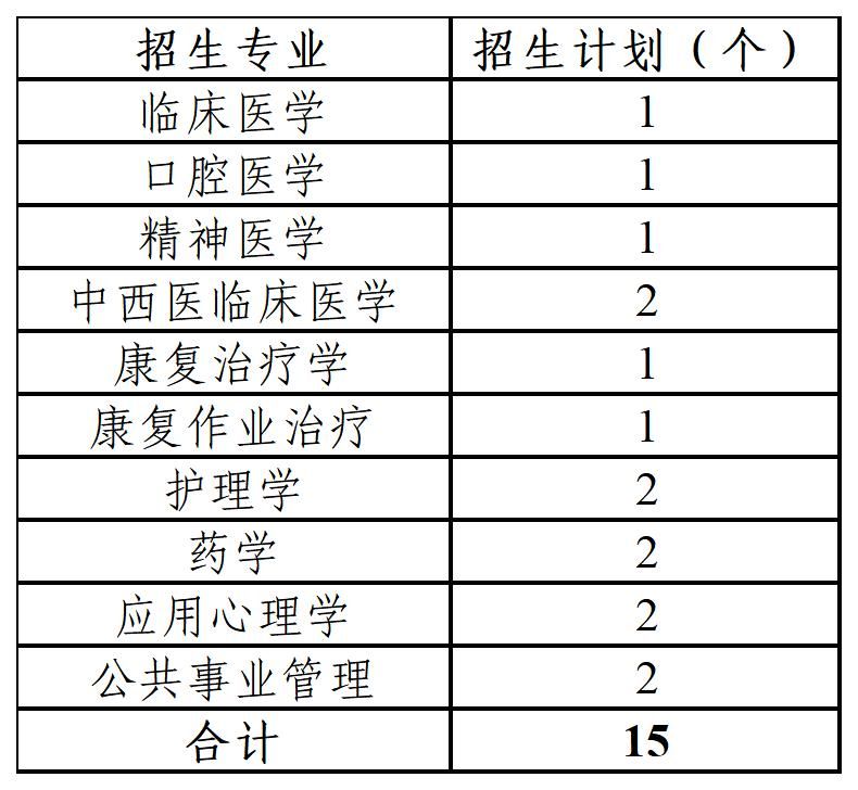 临床医学、口腔医学、精神医学、中西医临床医学、护理学、药学、康复治疗学、康复作业治疗、应用心理学、公共事业管理等十个本科专业。